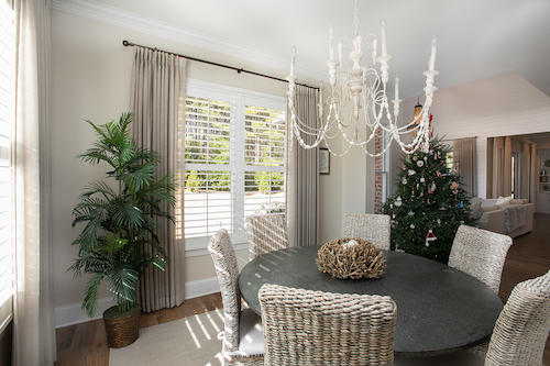 We love this combination of crisp white shutters and flowing tan drapery panels! Layering window treatments adds interest and versatility to any space.